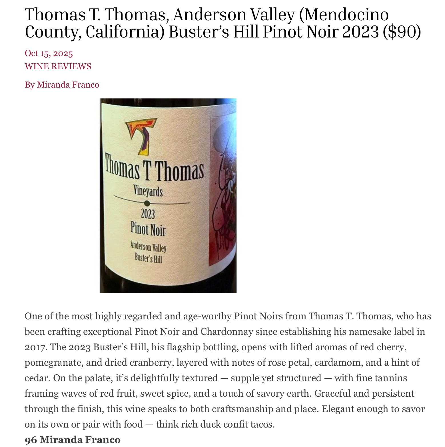 "A Burgundian Vision: The New and Old Worlds Unite at Thomas T Thomas Vineyards", The Somm Journal