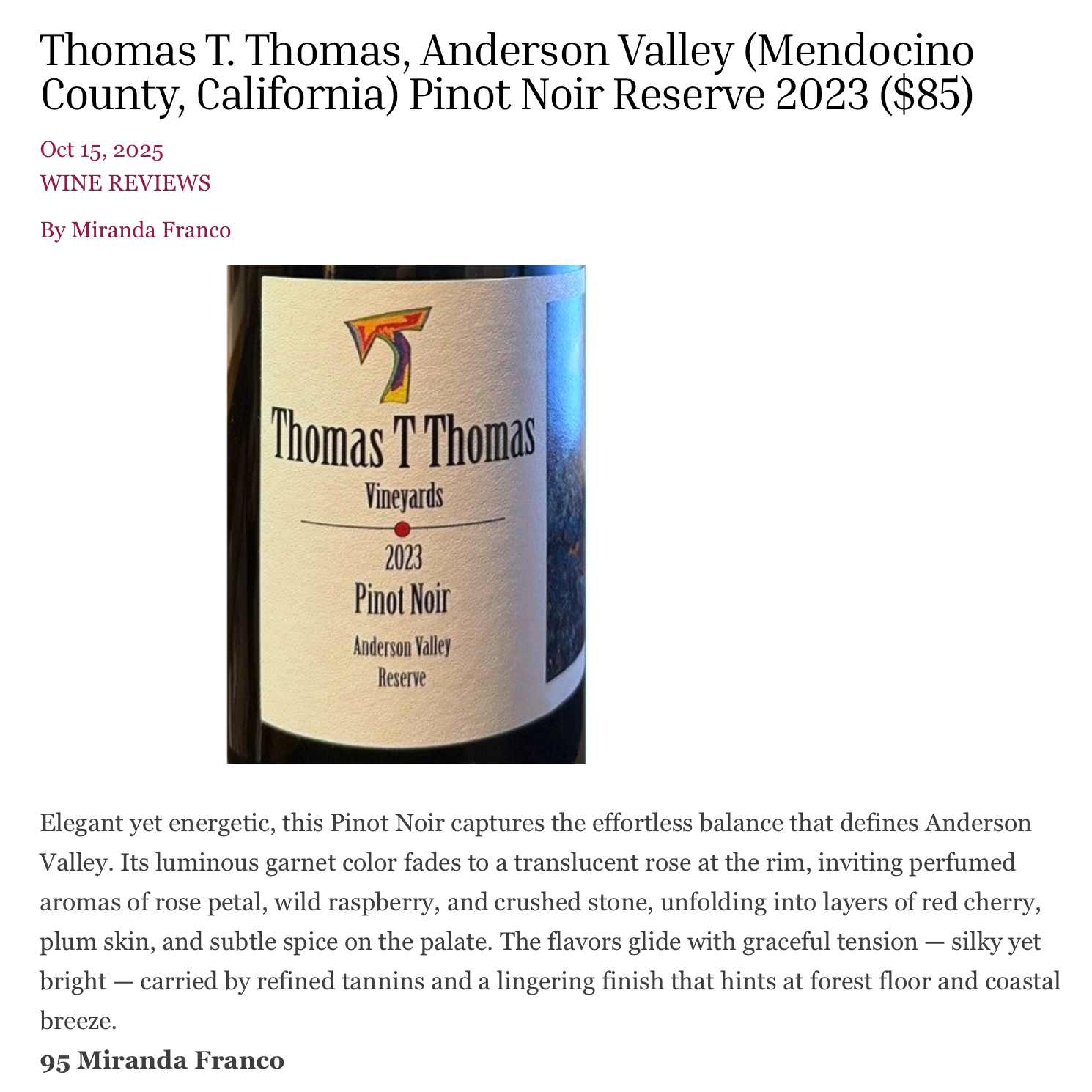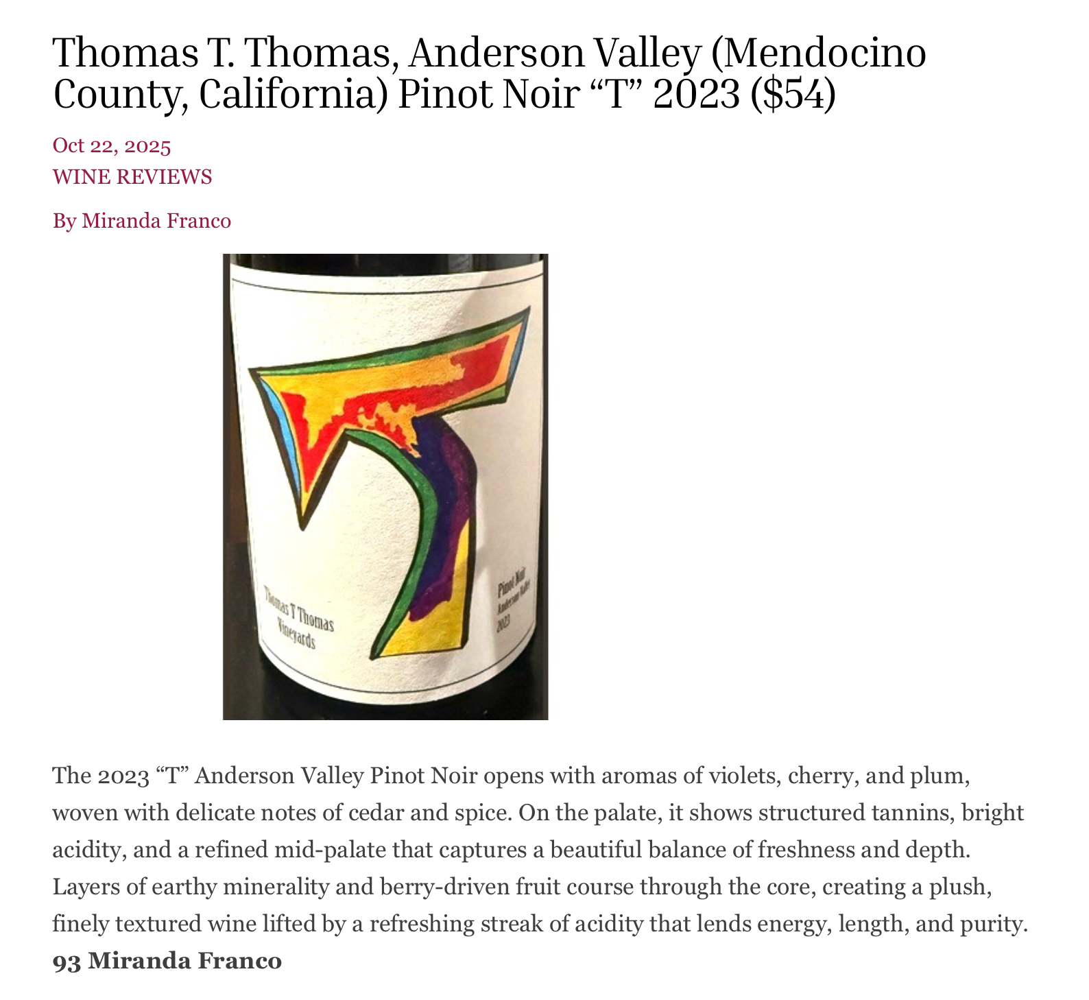 2023 "T" Pinot Noir, Wine Review Online